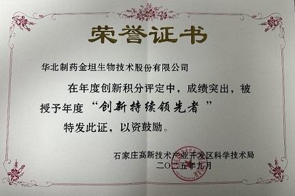 近日,在石家庄高新区年度创新积分评定中,金坦公司成绩突出,被授予年度“创新持续领先者”荣誉称号。这项荣誉不仅是对公司创新能力的高度认可,更是对公司研发创新所作贡献的充分肯定。