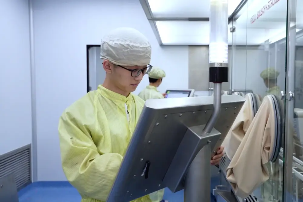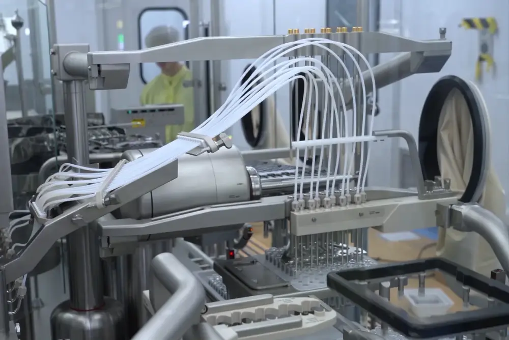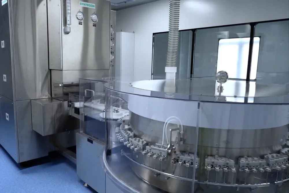 制剂生产选用德国B+S全自动分装生产线,从洗瓶、灭菌、灌装、加塞到压盖均全自动进行。灭菌隧道内为百级层流,灌装与加塞也在层流下进行,为了保证灌装质量,在百级层流灌装区设有两台在线尘埃粒子检测器,随时监测空气中的尘埃粒子。生产选用的胶塞为美国West公司的免洗产品,装在有呼吸层的塑料袋内,灭菌后直接使用。生产选用的预充注射器为法国BD公司产品,为无菌、无热原、洁净包装,可直接使用。分装生产线还采用了传送带分段传送的措施,解决了分装制品穿越不同洁净级别区域,传送带造成污染的问题。制剂生产选用的冻干机为德国Finn Aqua公司产品,可自动压塞,具有在位消毒功能。这些先进的硬件设施有效保证了最终产品的质量。